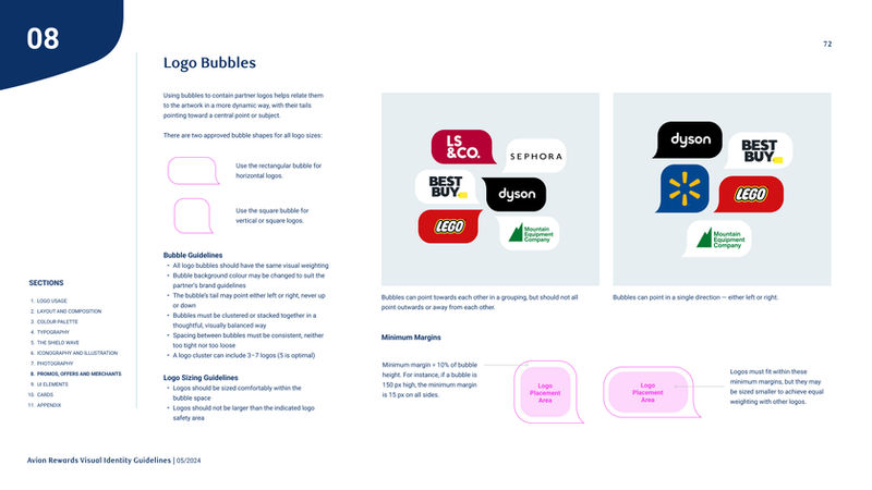 The rectangular and square variations of the bubbles enable all sizes of merchant logo – from extreme horizontal to vertical stacked logos – to be sized optimally and with equal weighting. The bubble "tails" can point towards each other or towards another element in the layout to create an implied connection and conversational quality to the creative. In the below style guide exerpt, you can see the versatility of the bubble shape and how the new brand assets come together to create impactful communication pieces.