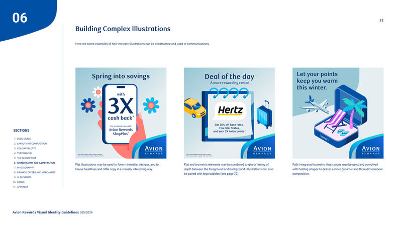 The final illustration system, shown in the style guide exerpt below, contains 4 tiers ranging from simple functional icons to more complex isometric illustrations. The colour palette is deliberately limited, with RBC Bright Blue serving as the unifying element throughout, enhancing brand recognition and consistency. By incorporating the Shield Wave as a recurring pattern in all illustrations, the style achieves a high level of cohesion and uniqueness specific to Avion Rewards. This approach not only brings simplicity and boldness to the brand but also ensures a memorable and ownable visual identity.