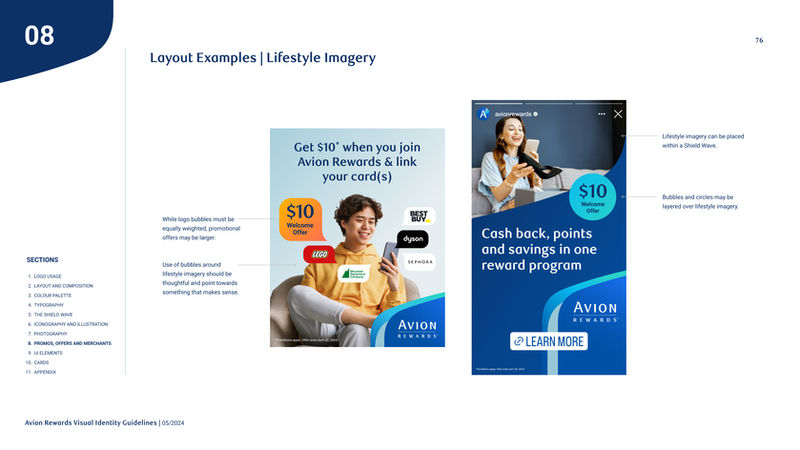 Since Avion Rewards is a digital-first brand, it was important to have consistency with logo usage across many types of digital specs. After rigorous pressure-testing, we established a simple sizing calculation that achieves similar weighting to the logo lockup at any size. We also developed a secondary logo lockup that lives in the top-left corner of the canvas for any digital applications (ie. Instagram Reels) where the primary logo lockup would be covered by UI overlays.
